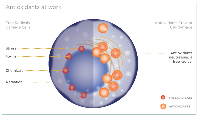 Os antioxidantes são moléculas que combatem os radicais livres no organismo. Os radicais livres são compostos que podem causar danos se os seus níveis se tornarem demasiado elevados. Os antioxidantes são factores-chave na luta contra os danos a nível celular e níveis inadequados destes importantes compostos podem resultar numa diminuição da capacidade de combater doenças, recuperar de exercícios intensivos, lidar com o stress da reprodução e doenças crónicas.