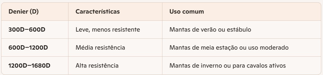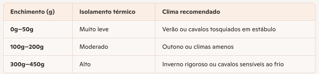 - Enchimento (g): Refere-se ao isolamento térmico. Um cobrejão cavalo com 0g–50g é ideal para verão ou cavalos tosquiados. Mantas com 100-200g são indicadas para outono ou climas amenos. Já os modelos com 200g–400g são perfeitos para os dias frios de inverno.