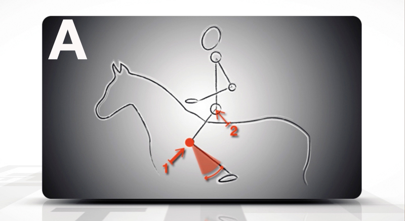 Antes, utilizando o Knee-Block tradicional, a pressão era limitada aos joelhos, tornando as ajudas naturais mais limitadas. A força era gerada para cima, tornando a posição do cavaleiro instável (como visto na imagem A, ponto 1).