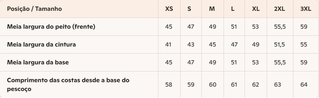 Dica de tamanho: Em caso de dúvida entre dois tamanhos, opte pelo maior.
